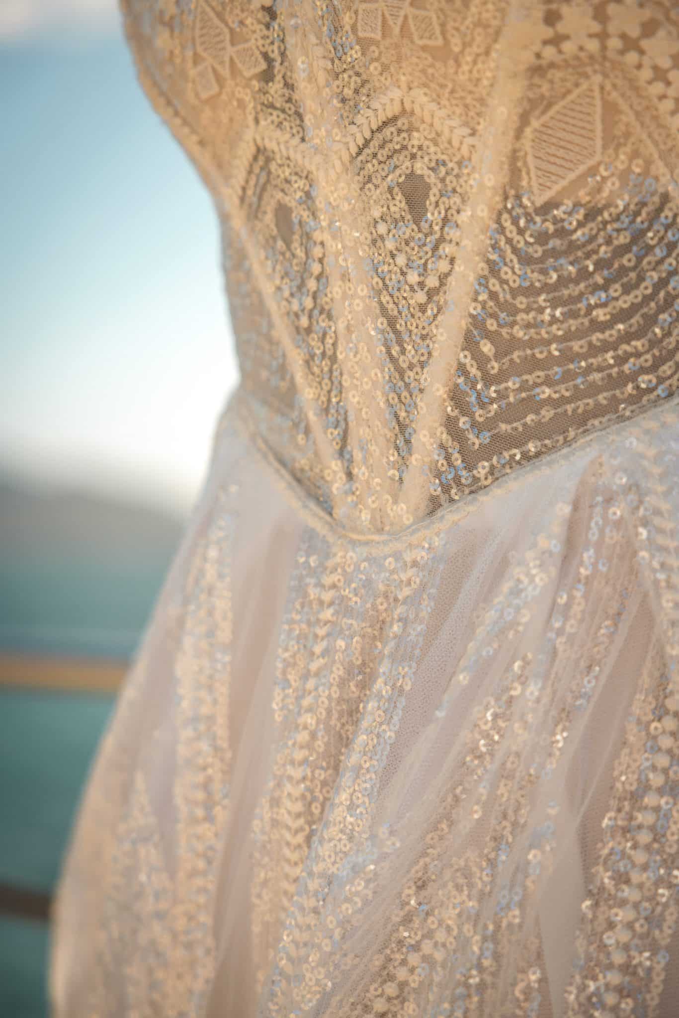 La singularité du modèle Samena réside avant tout dans sa palette chromatique et la qualité de ses étoffes. Cette robe de mariée propose une alternative luxueuse aux blancs traditionnels, apportant une douceur et un éclat incomparables à votre teint. Le tulle de soie sélectionné par nos stylistes couturières est travaillé en plusieurs couches pour obtenir un volume à la fois aérien et structuré. Un travail minutieux de perlage et l’insertion de micro-paillettes au cœur du tulle créent un jeu de lumière cristallin, qui capte l’éclat de chaque mouvement sous le soleil de Provence avec une discrétion absolue.