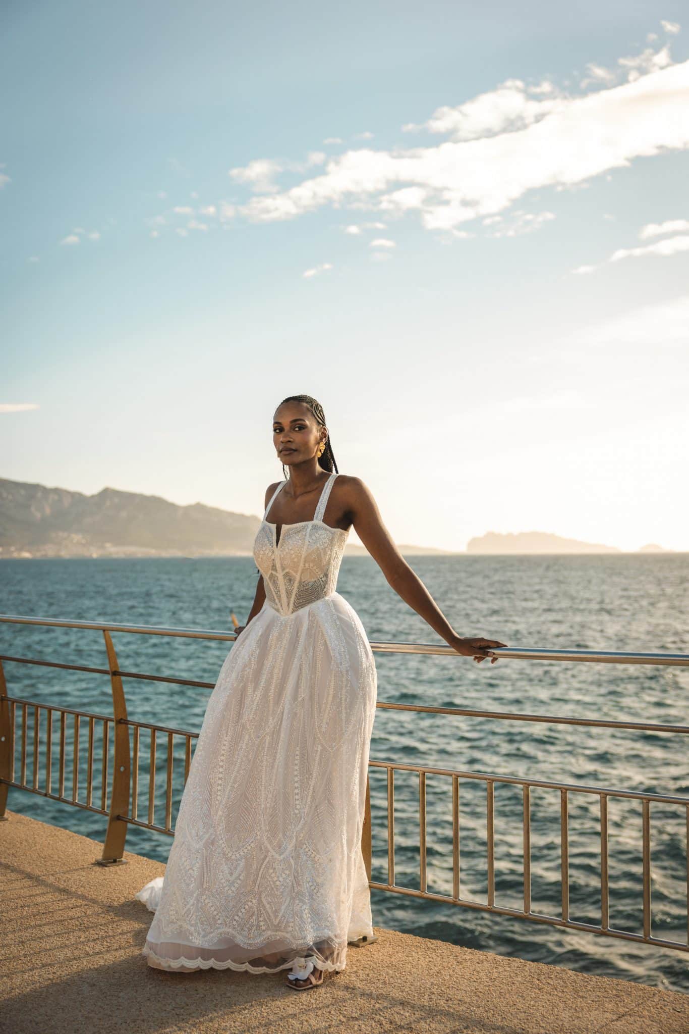 La structure du modèle Samena repose sur un bustier corset apparent, véritable démonstration de notre savoir-faire technique. Ce corset ne se contente pas de dessiner une taille parfaite ; il est conçu pour assurer un maintien irréprochable et un confort total tout au long de votre journée. Le travail de broderie, mêlant lignes géométriques et perles nacrées, est appliqué avec une rigueur extrême pour garantir une symétrie parfaite et une tombée de matière impeccable. Les bretelles délicatement travaillées viennent parfaire l’équilibre de la silhouette, témoignant de notre attention constante aux détails de finition qui font la différence entre une robe standard et une création de créateur.